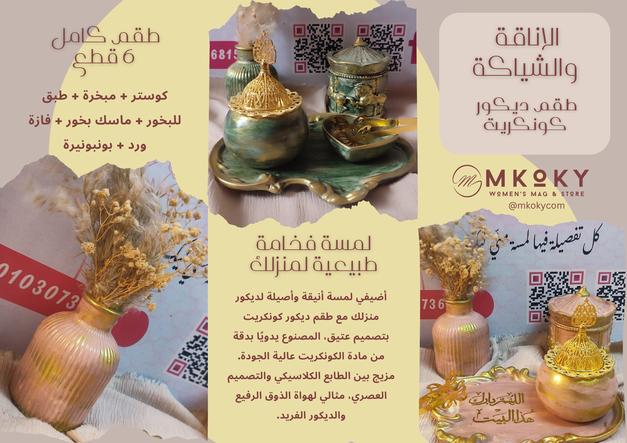 طقم ديكور كونكريت – ديكور يدوي عتيق – مبخرة أرابيسك – فازات كونكريت – هدايا منزلية أنيقة – أطقم ديكور يدوي – ديكور مودرن كلاسيك